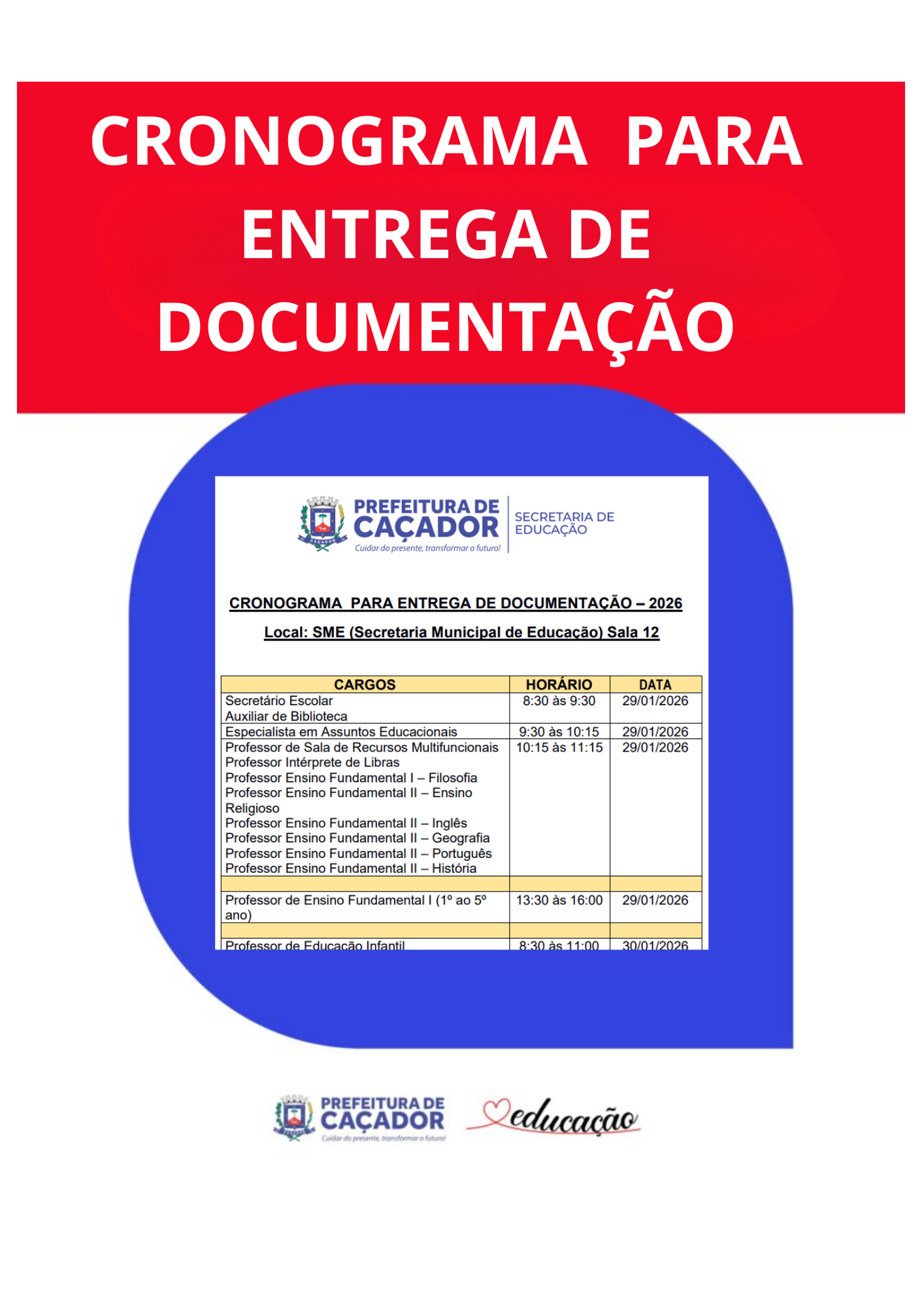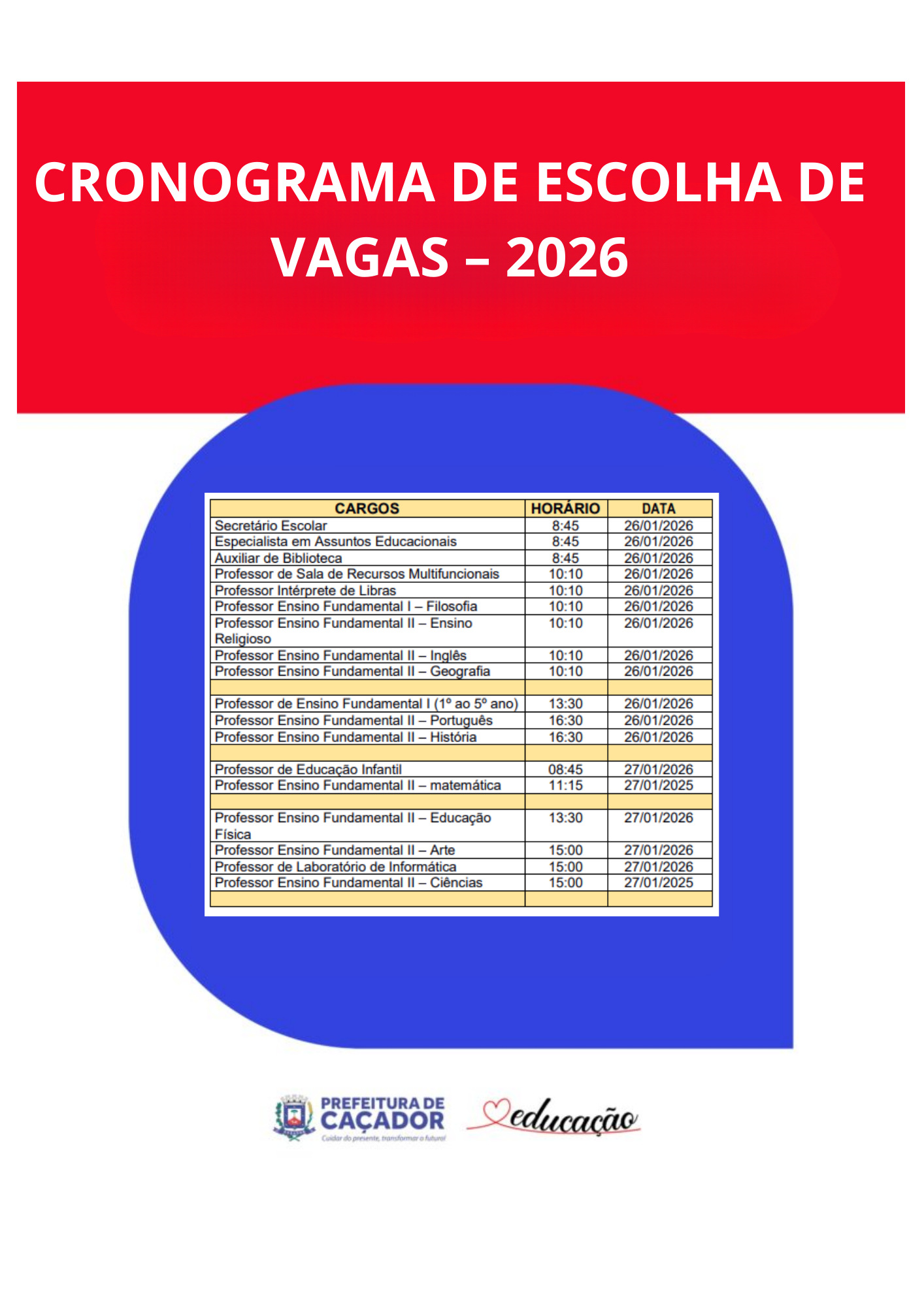 Tabela de horários por cargo: CARGODATAHORÁRIOESPECIALISTA EM ASSUNTOS EDUCACIONAIS – 40 HORAS 21/01/20268HSECRETÁRIO ESCOLAR –…